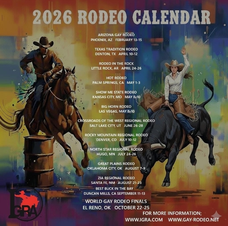 The 2026 Gay Rodeo season kicks off with IGRA University in Las Vegas (Jan 16-18) and the Arizona Gay Rodeo in Phoenix (Feb 13-15), followed by events like the Texas Tradition Rodeo (Denton, April 10-12) and regional qualifiers in Salt Lake City (June 6-28), leading up to the World Gay Rodeo Finals in El Reno, OK (Oct 22-25). Key events include the Big Las Crossroads Regional in Salt Lake City and the Rocky Mountain Regional in Denver, with dates and locations detailed by the International Gay Rodeo Association (IGRA).